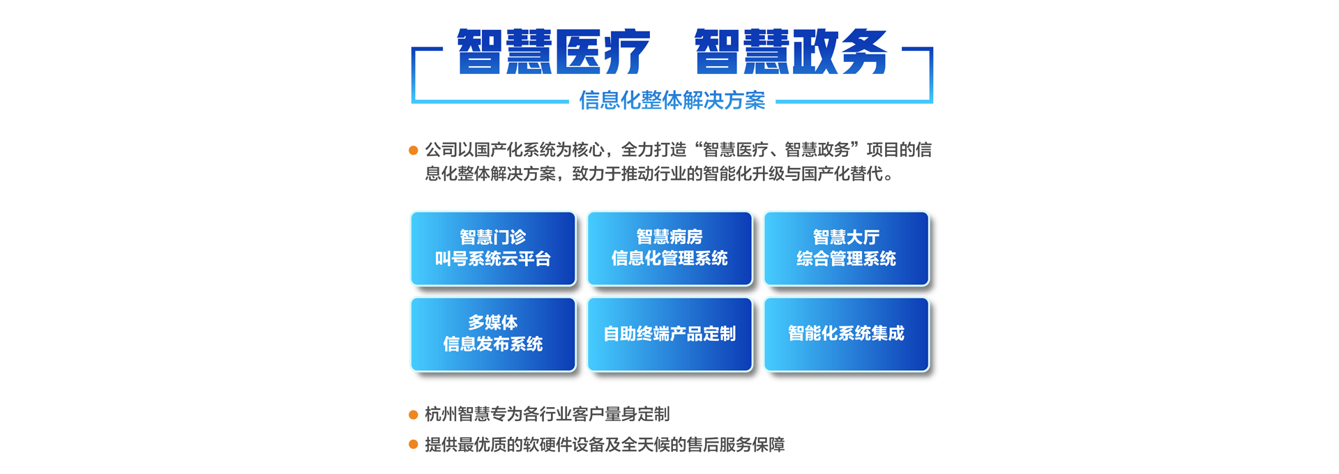 杭州智慧科技有限公司初創(chuàng)于2003年,總部位于重要的電子商務(wù)中心中國杭州公司主營業(yè)務(wù)有:智慧分診叫號系統(tǒng)、智慧病房醫(yī)護(hù)對講系統(tǒng)、智慧大廳綜合管理系統(tǒng)、智慧政務(wù)管理系統(tǒng)、智慧多媒體信息發(fā)布系統(tǒng)、導(dǎo)診系統(tǒng)及各自助終端產(chǎn)品定制。專為各行業(yè)客戶量身定制。公司已有20余年行業(yè)經(jīng)驗(yàn)沉淀積累,擁有優(yōu)秀的產(chǎn)品外觀設(shè)計師和各類中高級專業(yè)技術(shù)工程師,確保所研發(fā)的產(chǎn)品具有行業(yè)領(lǐng)先的外觀及可靠的技術(shù)性能。并擁有權(quán)威部門頒發(fā)的各類知識產(chǎn)權(quán)及專利證書,30多項資質(zhì)證書、800多個合作伙伴、2000多個項目成功案例經(jīng)驗(yàn)。 智慧產(chǎn)品已遍及全國各醫(yī)療、政務(wù)、金融、通訊、公安、工商、稅務(wù)等行業(yè),形成以“立足杭州、輻射長三角、拓展全國”的戰(zhàn)略發(fā)展格局,產(chǎn)品經(jīng)過歷年不斷創(chuàng)新,形成專業(yè)化、平臺化,致力于成為智慧產(chǎn)品的領(lǐng)軍企業(yè)。 公司建立了完善的技術(shù)培訓(xùn)及售后服務(wù)中心,并設(shè)24小時熱線咨詢電話解答用戶反饋的問題。同時應(yīng)客戶要求定期派技術(shù)人員到 全國各地進(jìn)行技術(shù)指導(dǎo)輔助用戶正確使用智慧產(chǎn)品并能獨(dú)立安裝、調(diào)試、日常維護(hù)等工作。提供最優(yōu)質(zhì)的設(shè)備及全天候的售后服務(wù)保障,智慧永恒不變的服務(wù)宗旨——致力于客戶的滿意與成功!...